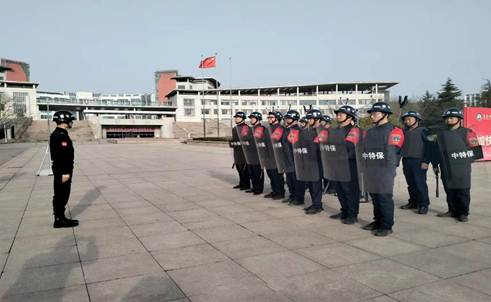在对暴力闯岗的处置演练中,模拟暴乱分子企图闯入校门制造恐怖事件,校应急分队接到报警后迅速响应,指挥门卫关闭大门并设置路障,警戒组和抓捕组立刻穿戴防护装具成功阻退暴徒的恶意闯岗行为。